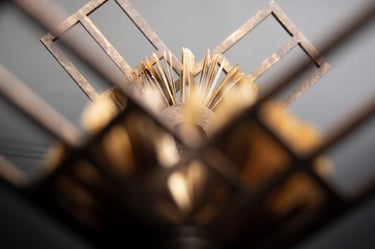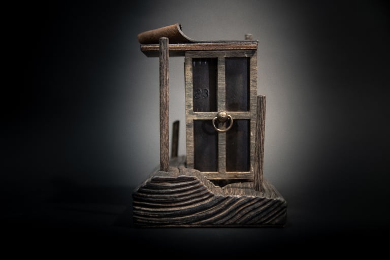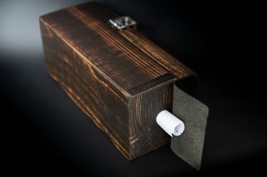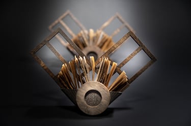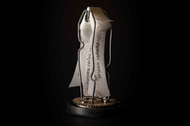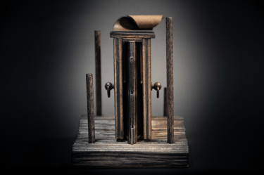 Medžiagos: popierius, žalvaris, laikrodžio mechanizmas, medis.