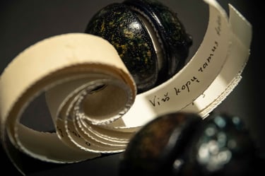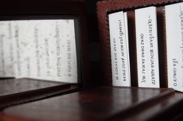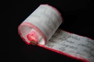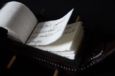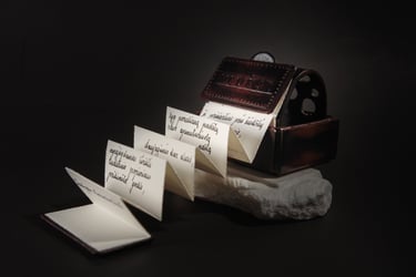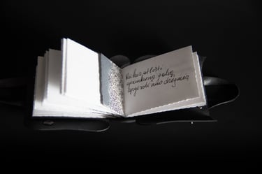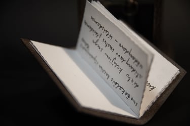 Knygos-objekto „54 miniatiūros“ dvidešimt šeštas puslapis (iš knygų ciklo „Polymnijos įkvėptieji“, 2024). Rankraštis.