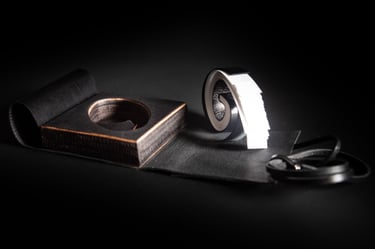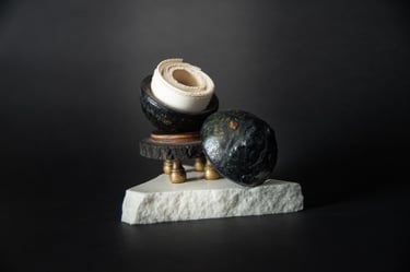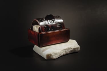 Medžiagos: oda, marmuras, metalo detalės, smėlio laikrodis, popierius.
