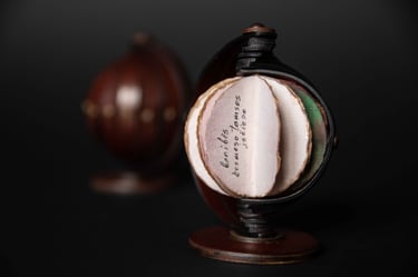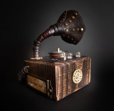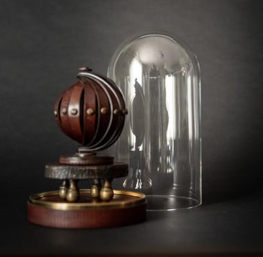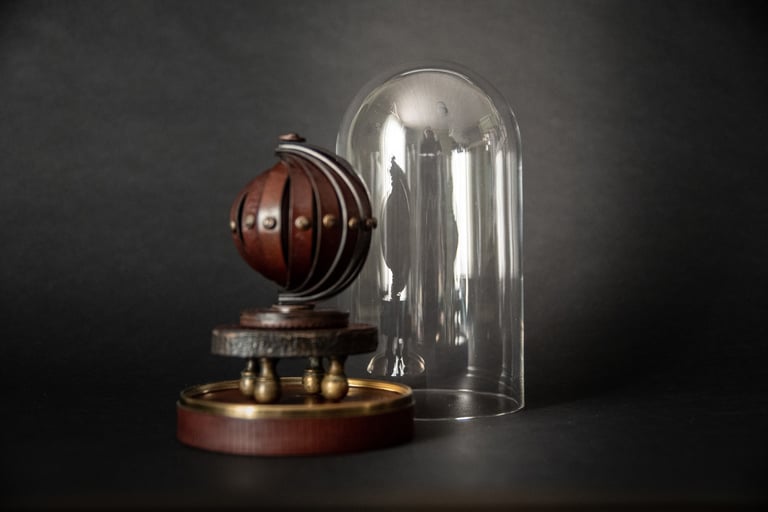 Medžiagos: oda, metalo detalės, stiklo gaubtas, medis, popierius.