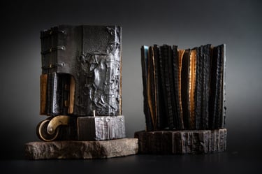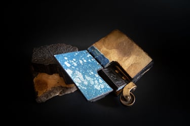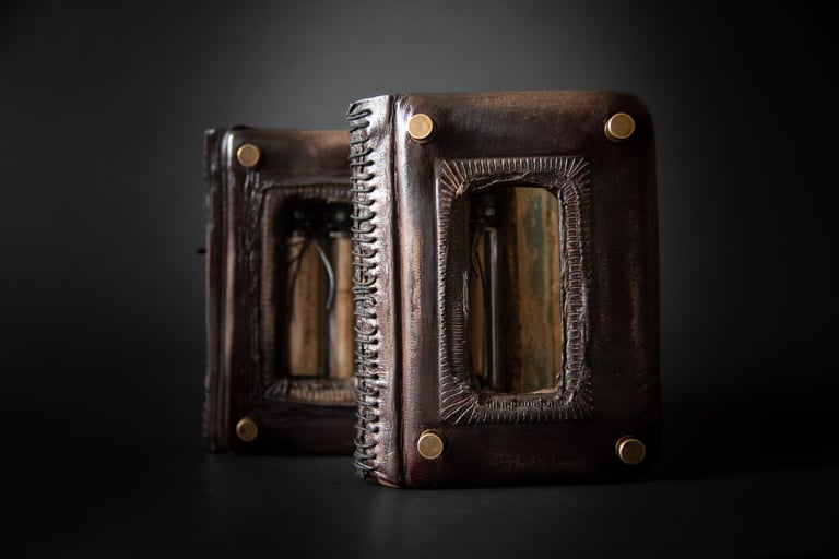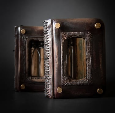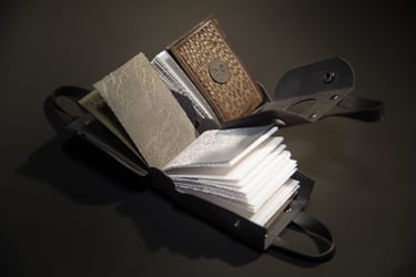 Medžiagos: oda, metalo detalės, akvarelinis medvilnės popierius, kartonas.