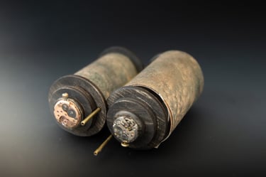 Medžiagos: medis, oda, žalvaris.