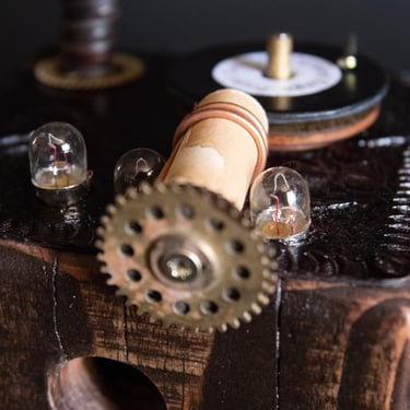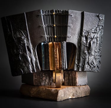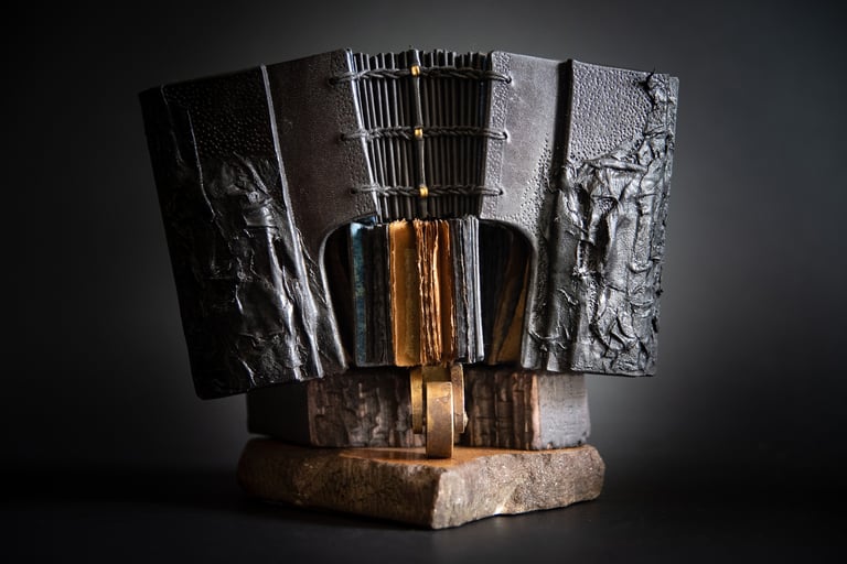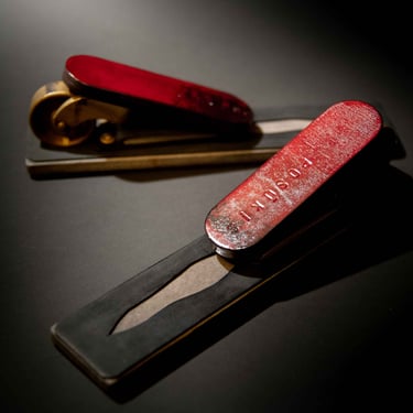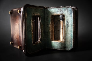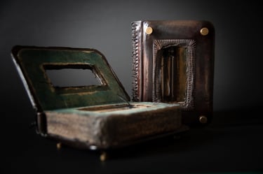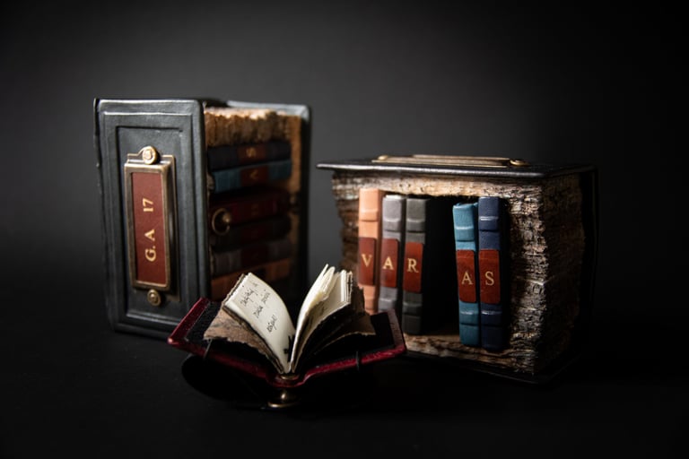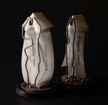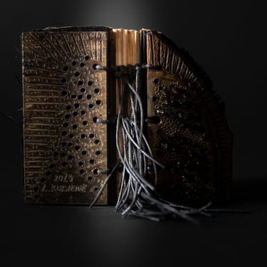 Medžiagos: oda, varis, žalvaris metalo detalės, popierius, medis.
