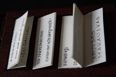 Knygos-objekto „54 miniatiūros“ antras puslapis (iš knygų ciklo „Polymnijos įkvėptieji“, 2022). Rankraštis.