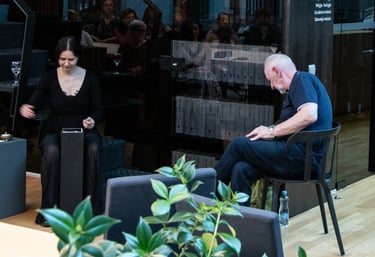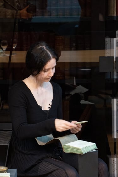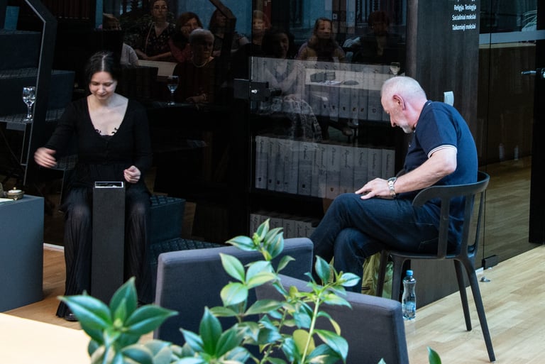 Parodoje „Polymnijos įkvėptieji“, 2023 (M. K. Čiurlionio muziejus) buvo atliktas performansas „Dialogas“, kurio metu romano autorius skaitė knygos ištrauką, o aš - knygos leidėja, tuo pačiu metu įrišau tekstus į knygos bloką.